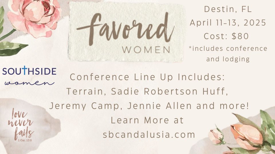 Gather together with Southside Women of all ages for the Favored Women Retreat. Held in Destin Florida, we'll spend 2 nights in beautiful homes within walking distance of the beach! Conference Line Up includes Terrian, Margaret Feinberg, Sadie Robertson Huff, Jeremy Camp, Allison Speer, Jennie Allen, Favored Worship and more!