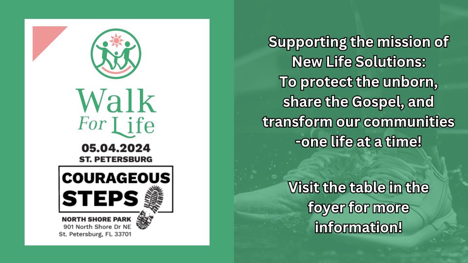 New Life Solutions will have their annual "Walk for Life" on Saturday May 4th. This event is held at North Shore Park in St Petersburg. The mission of New Life Solutions is to protect the unborn, share the Gospel, and transform communities - one life at a time. For more information on how to become a fundraiser or how to support this ministry, visit the table in the foyer or call the church office. You can also visit iwalkforlife.com to find out more. You can make a difference!