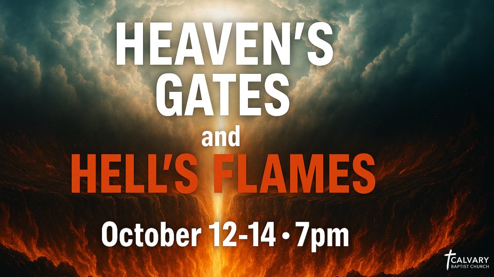 Come join us for a FREE EVENT! October 12th, 13th, or 14th at 7 pm! Step into an unforgettable experience with "Heaven's Gates and Hell's Flames" by Reality Outreach Ministry. This powerful drama brings eternity to life, portraying life-changing decisions and their eternal consequences. Join us for a riveting journey sure to impact your heart and soul!