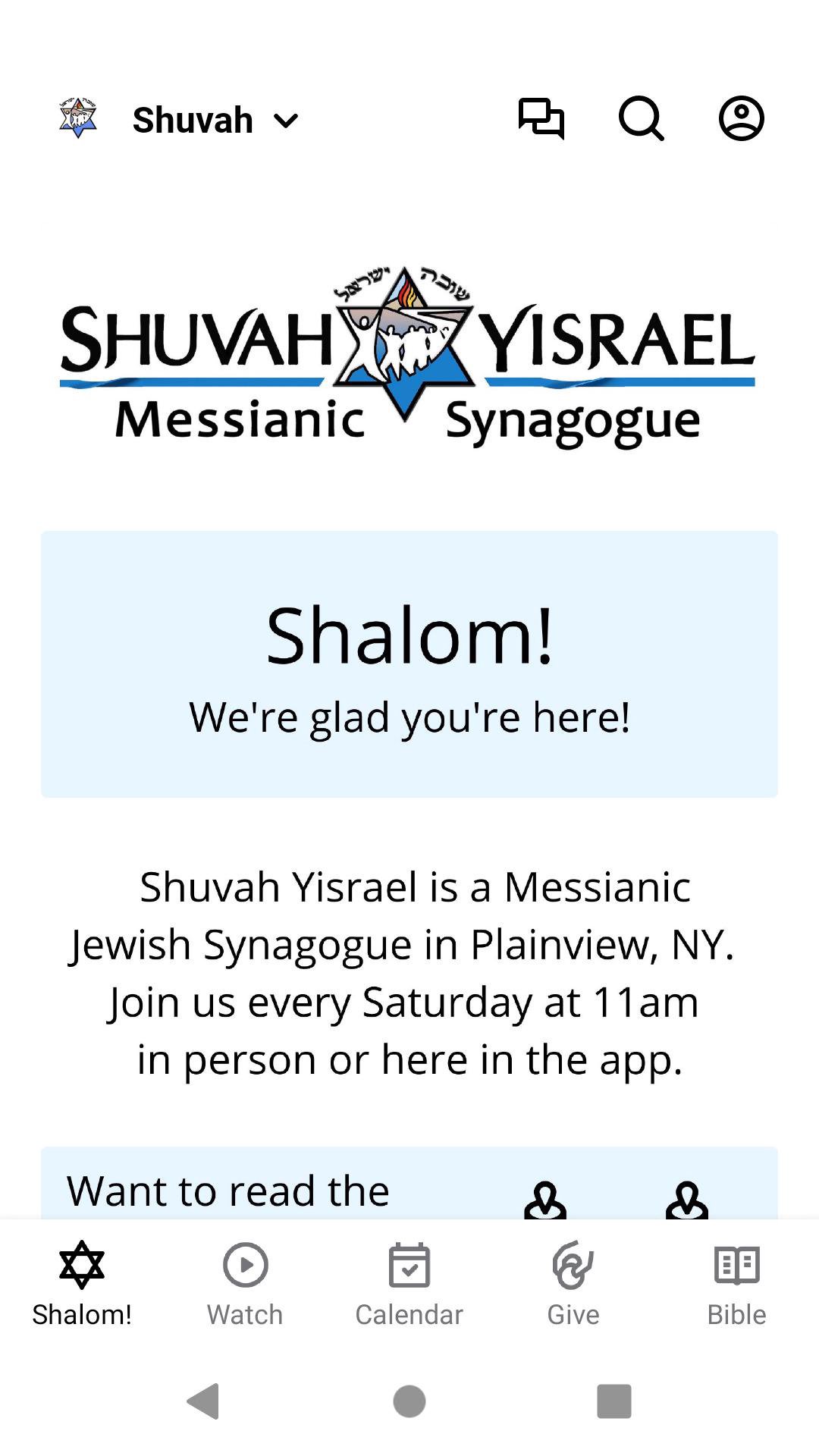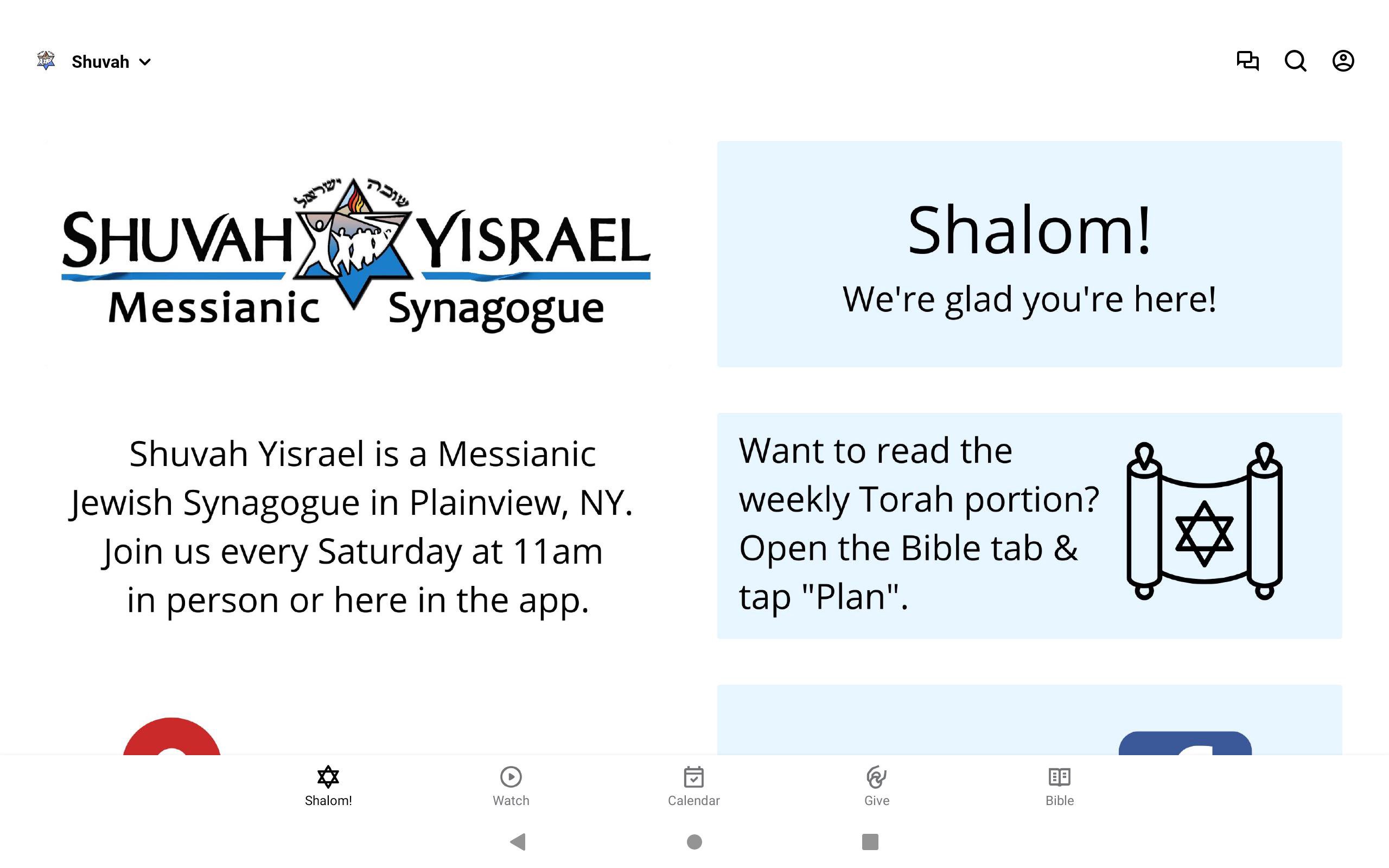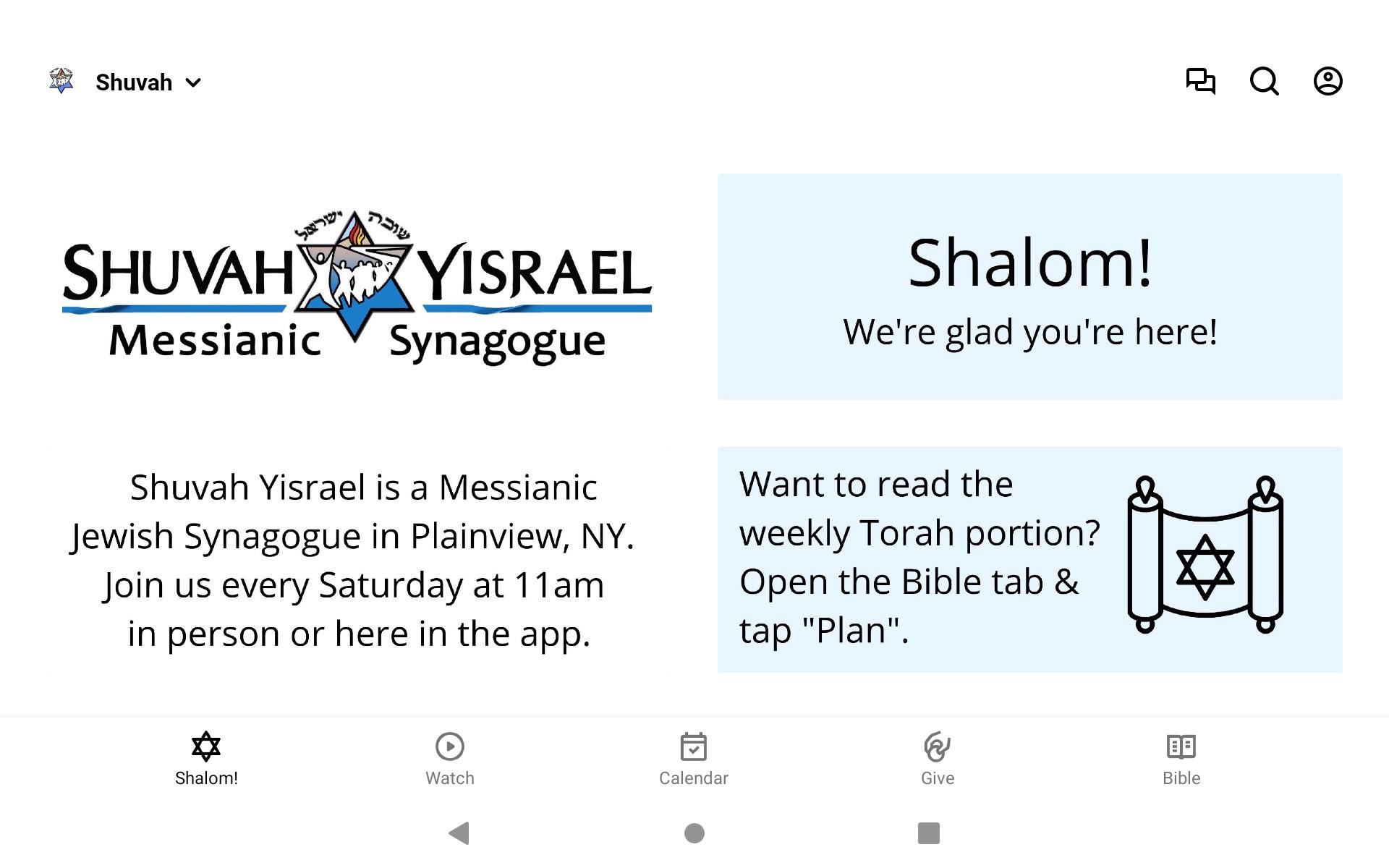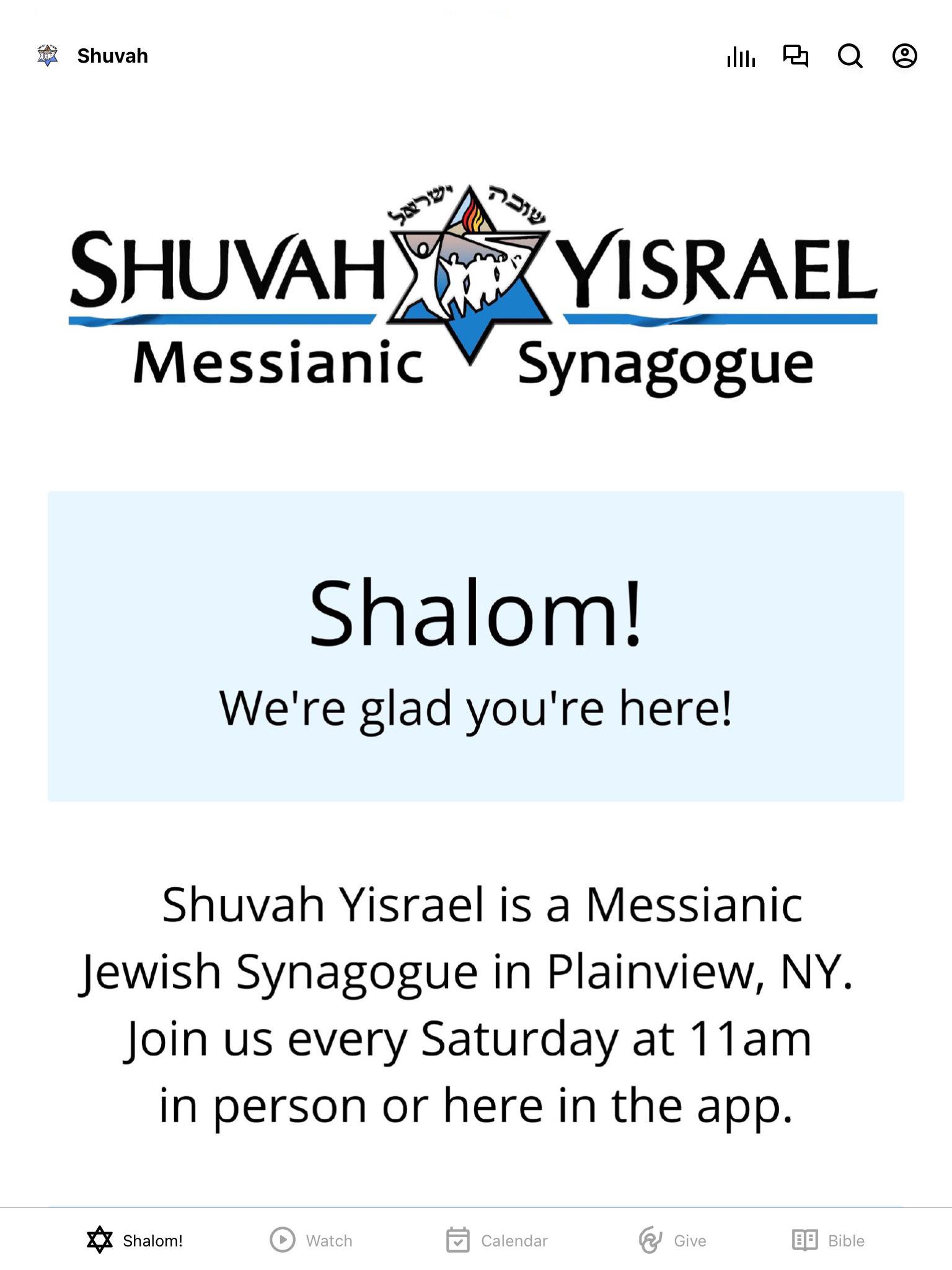 Shalom! We're glad you're here! Shuvah Yisrael is a Messianic Jewish Synagogue in Plainview, NY. Join us every Saturday at 11am in person or here in the app.