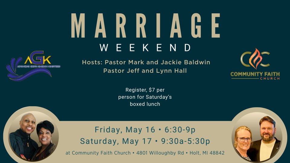Pastor Jeff and Lynn Hall are teaming up with Pastor Mark and Jackie Baldwin! This event will be filled with fun, insight, and most of all the presence of God! We look forward to taking time to focus on our marriages, being more biblical, growing closer, and truly experiencing the JOY of a Godly but imperfect marriage! Join us... It will be a great weekend!!