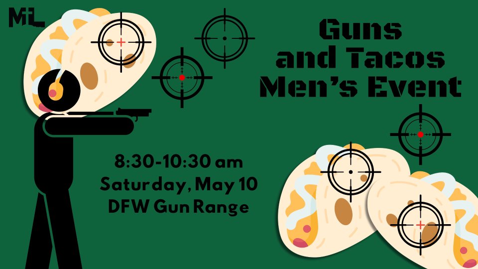 Men, join us for a great time of fun and fellowship as we have breakfast tacos and show off our skills (or lack thereof) at the DFW Gun Range. The cost is $55 per person.