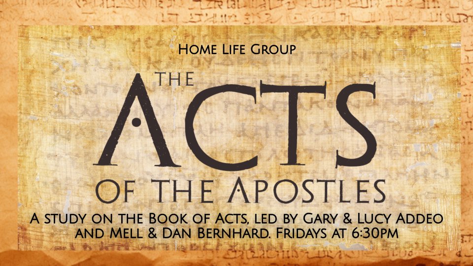 A study on the Book of Acts, led by Gary & Lucy Addeo and Dan & Mell Bernhard, Fridays at 6:30pm. Contact Mell Bernhard at mellowbernhard@gmail.com for more info.
