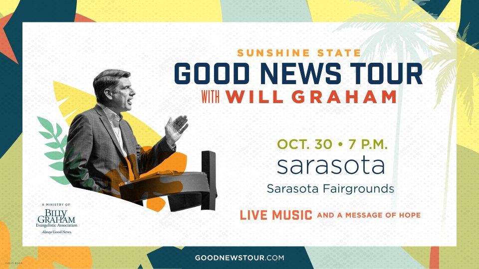 Join us for the powerful main event of the Billy Graham Evangelistic Association's Good News Tour with Will Graham, right here in Sarasota! This is more than just a night of worship—it's a life-changing opportunity for our community to encounter the hope and love of Jesus Christ.