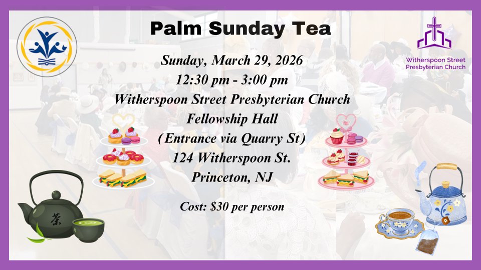 Join Witherspoon Street Presbyterian Church's Presbyterian Women for an exquisite Palm Sunday Tea after church on March 29th! This delightful event will feature a selection of fine teas to please your palate. Whether you're a tea enthusiast or someone who enjoys the beauty of the spoken word, this gathering promises a blend of relaxation, refinement, and inspiration. Come savor the moment, enjoy the company, and indulge in our carefully curated tea menu. Let's create memorable moments together. Register now to ensure your place on this unique and enchanting afternoon. You can secure your spot by visiting our website at https://subspla.sh/pntkkmt .