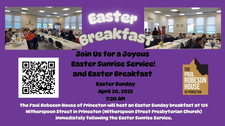 Join us in the Fellowship Hall of Witherspoon Street Presbyterian Church, located at 124 Witherspoon Street in Princeton, for EASTER Sunday Breakfast hosted by the Paul Robeson House of Princeton. This gathering will take place immediately following the Easter Sunrise Service. We invite all attendees to register if you plan to enjoy the breakfast so we can ensure everyone is accommodated. Your participation is greatly appreciated as we celebrate this special occasion.