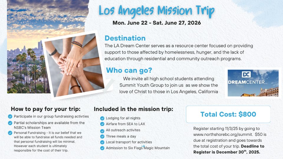 We’re heading to Los Angeles next summer for an unforgettable week of service and ministry! From June 22–27, our team will partner with the LA Dream Center, serving through hands-on outreach such as food distribution, meal prep, donation sorting, foster-care support projects, community cleanups, and more. Most importantly, our students will have the opportunity to share Christ’s love in real and meaningful ways.