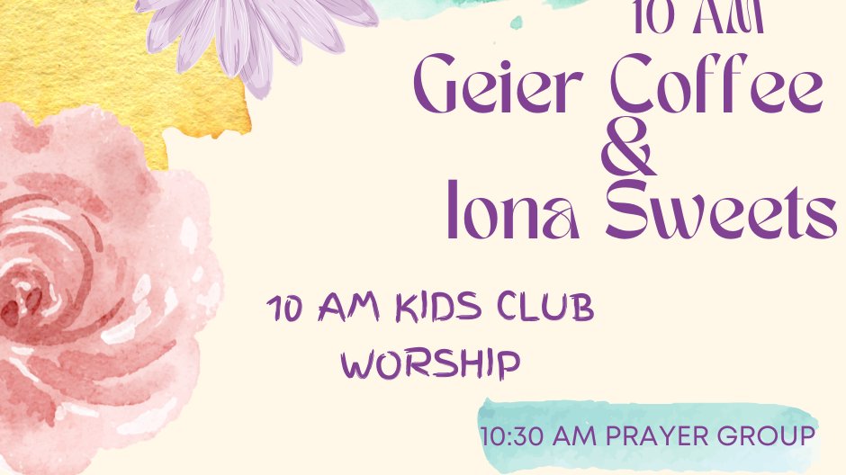 Join us on Sunday, April 6th at 10am for a time of fellowship. Enjoy some Geier Coffee and Iona Sweets at 10am while the children have Kids Club Worship in the basement. At 10:30 am Prayer Group meets in the Fireside Room for a time of prayer. We have our service at 11:00 am and kids head to kids club at 11:30 am.