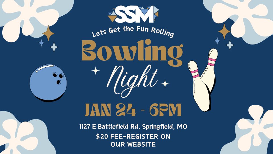 You'll be **rolling** in the fun as we go bowling at Andy B's. Only $20 gets you pizza, soda, arcade and more!