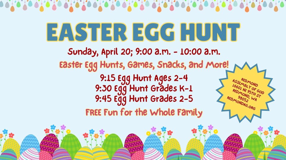 Sunday, April 20, 9:00 a.m. to 10:00 a.m. in the church gym. Come for Easter egg hunts, games, snacks, and more!