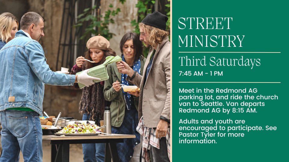 Meet in the Redmond AG parking lot on the third Saturday of each month. Take the church van to Seattle to distribute basic needs items, connect with people, and pray for them – to the extent that you are comfortable. Adults and youth are encouraged to participate.