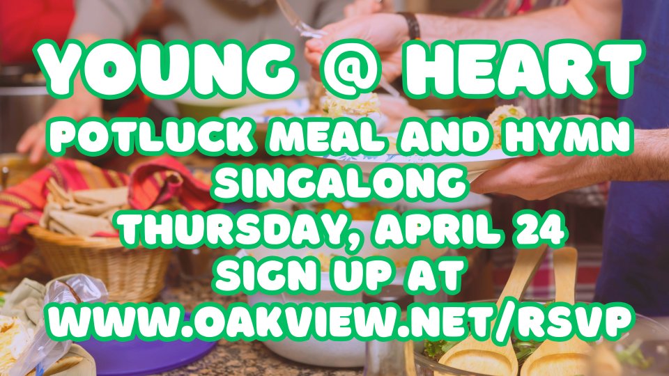 We will have a potluck meal and hymn singalong on Thursday, April 24, at 6:30 pm. Please bring your favorite dish. We will also sing some of your favorite hymns as we enjoy a fun night of fellowship. Sign up at www.oakview.net/rsvp and let us know what you are bringing.