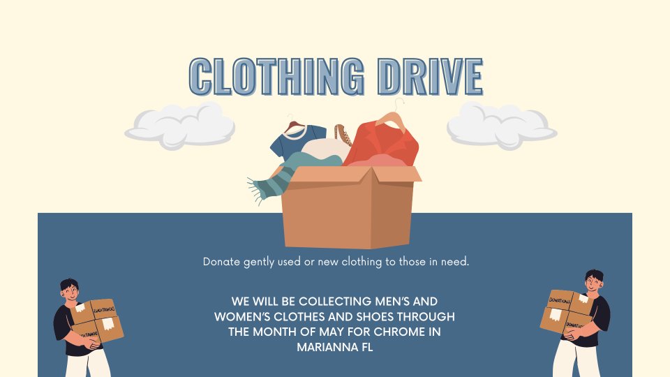 Please partner with us as we collect men's and women's clothes and shoes for Chrome. Chrome is a rehab facility located in Marianna, Florida. They are a Christian organization that houses and works with men. In June, they will be expanding their program to include women and are in need of clothing and shoes. Each participant who starts the program is given 10 outfits, and currently, they house around 150 men. Please bring items to the church, and we will collect and deliver them to Chrome. Thank you
