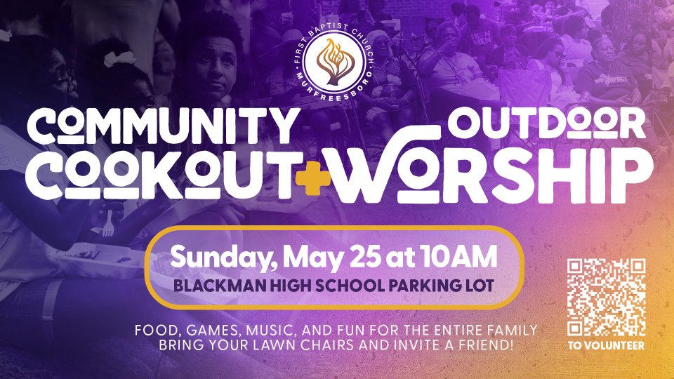 It is almost summertime kickoff, and you can sign up today to serve at our annual community cookout. We will have outdoor worship, food, games, and fun. On May 25th, meet us at Blackman High School Parking Lot for a glorious time worshipping and playing games with members and community members.