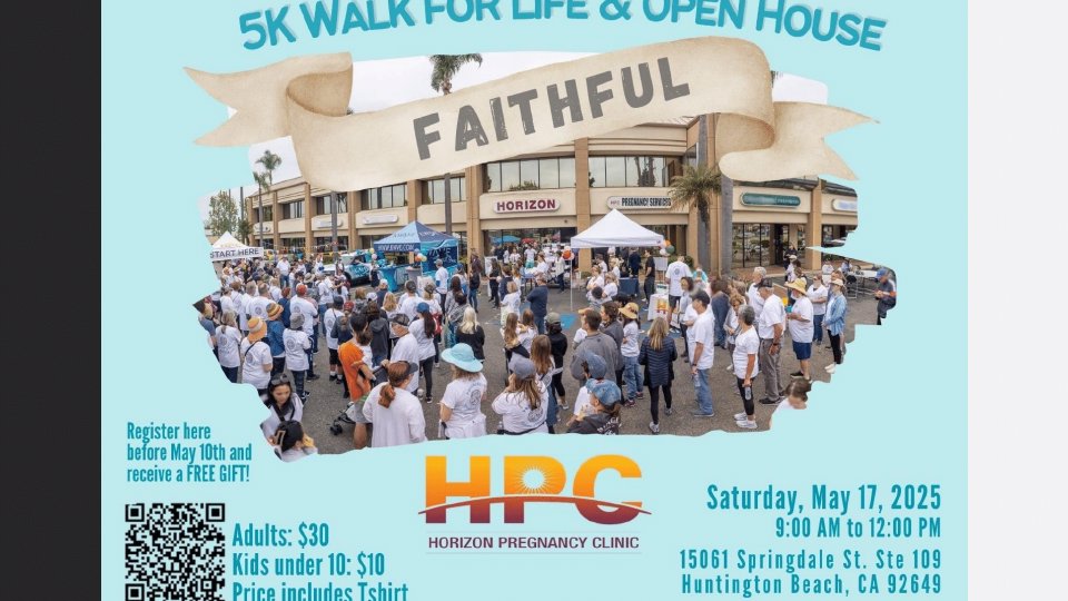 Come out and join Horizon Pregnancy Clinic in Huntington Beach for their annual Walk for Life and Open House on May 17, 2025. Learn about this amazing ministry, take a tour of their facility, and see the incredible mobile clinic they bring into the community. Lend your support to HPC and to the sanctity of life in Jesus’ name!