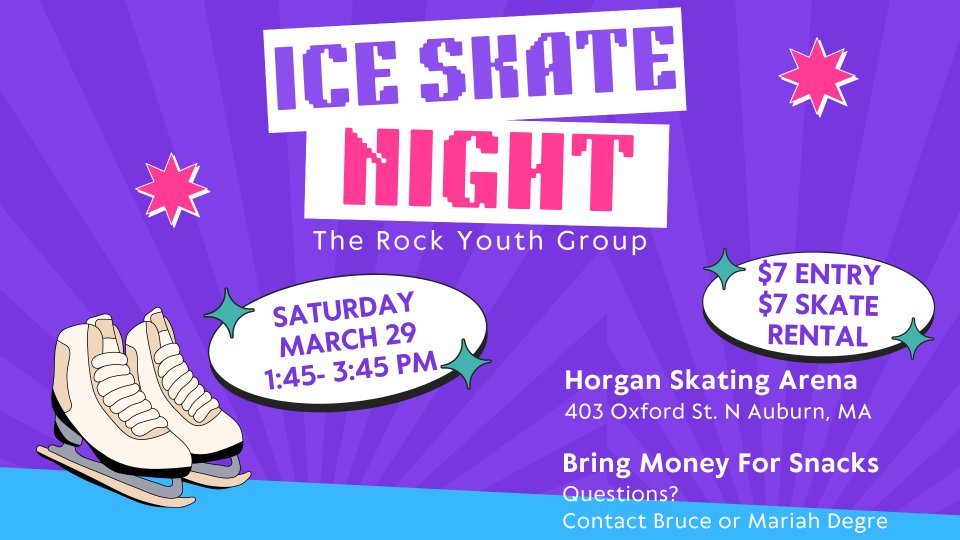 Horgan Skating Arena 403 Oxford St N, Auburn MA 01501 Saturday, March 29th We will meet there at 1:45 pm Public skating is from 2-3:50pm. $7 per admission $7 per skate rental if you need skates. You can bring your own and just pay admission There is a snack bar Food/drink is allowed outside the ice arena.