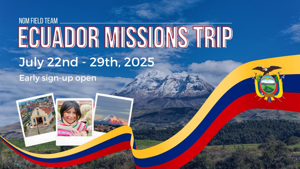 This mission trip will take a team of 50 individuals to Ecuador to work alongside missionaries Tech and Megan Carpenter. This is an opportunity for YTH students, ages 16-18, to step in faith and serve the Kingdom of God. The final cost is still being determined, as plane tickets and other costs are being finalized. The estimated cost is between $1,500 - $2,500.