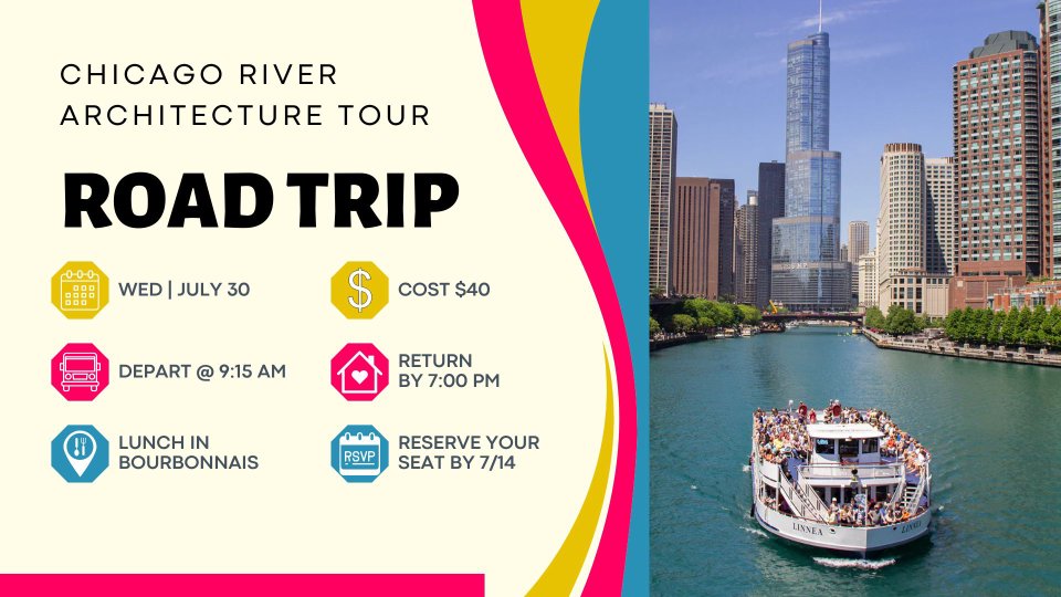 Our Road Trip team is planning a trip to Chicago for a river architecture tour. The cost for each participant is $40, which includes transportation and boat tickets. They plan to leave the church via the shuttle at 9:15 AM, have lunch in Bourbonnais, and be back home around 7:00 PM.
