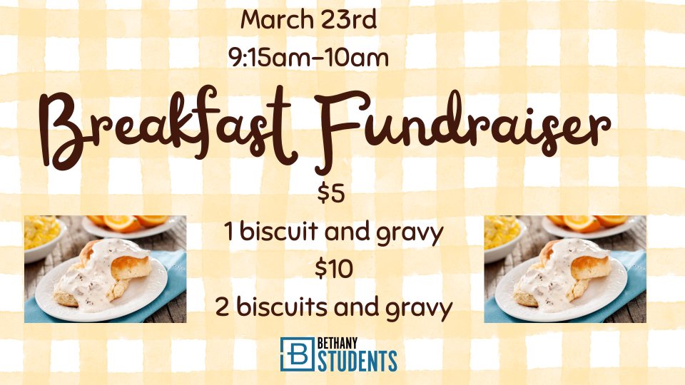 Join the Student ministry in support of Student Life Camp this summer by stopping by the Family Life Center on Sunday and grabbing breakfast before small groups. Come between 9:15am and 10am, grab a plate and go on to small groups. We have 1 biscuit and gravy for $5 and two of them for $10. Thank you for investing in our students.