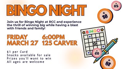 Join us for Bingo Night at RCC and experience the thrill of winning big while having a blast with friends and family! $1 per Card Snacks available for sale Prizes you’ll want to win!