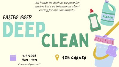Let's join our cleaning team in prepping for our friends and family! March 4th, 9am - 1pm! Come and go event! This is how we are intentional about caring for our community!