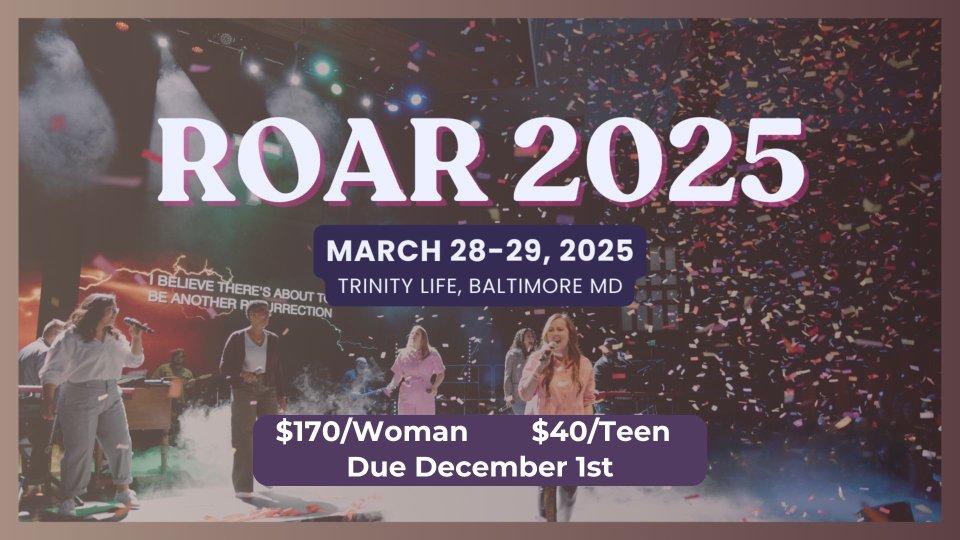 Join us for the ROAR 2025 Women's Conference in Timonium, Maryland, on March 28-29, 2025! This powerful two-day event is designed to inspire, equip, and empower women of all ages to step into their God-given purpose. Get ready for dynamic speakers, uplifting worship, and meaningful connections with women from all walks of life.