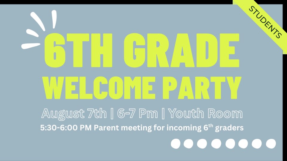 Incoming and outgoing 6th graders are invited to a student only event to welcome our new 6th graders to youth ministry! Pizza and games will be provided. Parents of incoming 6th graders are welcome to join us at 5:30 pm to meet with our Children’s and Youth ministry staff. This is a time to learn about youth ministry and ask any questions you may have!
