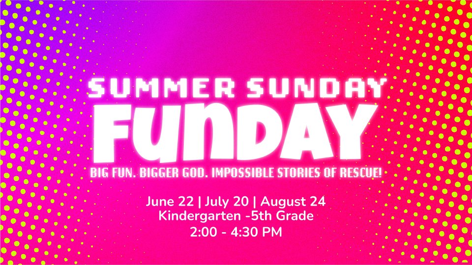 This summer, kids are invited to join us for Summer Sunday Funday—an afternoon packed with high-energy fun, unforgettable Bible stories, and moments that point to God’s amazing power and protection!