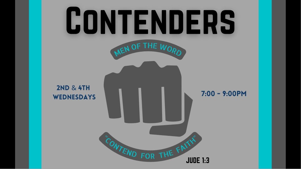 Contenders is our men's ministry. This group meets 2nd and 4th Wednesdays from 7 - 9PM for an in depth bible study and discussion.