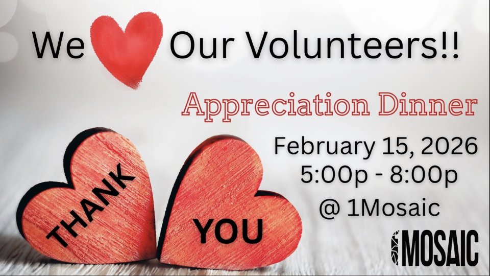 Save the date, 1M Volunteers! Mosaic Staff and Leadership are excited to celebrate YOU on February 15th!