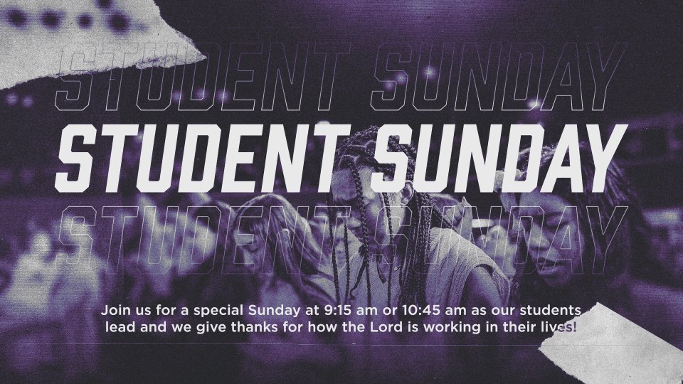 Join us for Student Sunday on March 22 at 9:15 am or 10:45 am as our students lead and we give thanks for how the Lord is working in their lives!