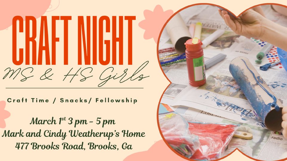 Middle and High School Girls: You're invited to a fun evening of crafts, snacks, and fellowship on Sunday, March 1 from 3-5 pm!
