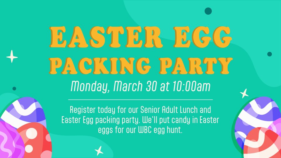 Register today for our Senior Adult Lunch and Easter Egg packing party. We'll put candy in Easter Eggs for our WBC egg hunt. This is a great way to serve together and participate in a great outreach event for our community! Please sign up by March 25.