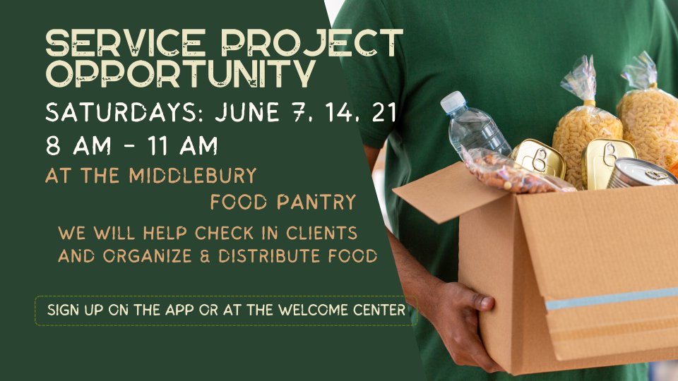 We will be partnering with the Middlebury Food Pantry every Saturday in June to distribute food.