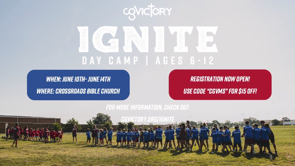 Embark on the Ultimate Adventure with CG Victory at Crossroads Bible Church! The CG Victory experience ensures your child dives into a world of non-conventional games, team challenges at a Gospel-based camp June 10 - June 14. At CG Victory, faith is a strong and integral part of the camp experience. In addition to the physical challenges, campers engage in activities that instill values like teamwork, resilience, and compassion from a Gospel perspective. We believe that what you do in life echoes for eternity, and at CG Victory, thousands of children will learn what it truly means to have the heart of a gladiator. Let them create lasting memories, form lifelong friendships, and develop the skills of a true gladiator. Spaces are limited, so secure your child's spot today and watch them thrive in the heart-pounding world of CG Victory! CGVictory Ignite Day Camp is for campers ages 6 - 12 years old. Visit their program page below for details and to register. USE CODE "CGVMS" FOR $15 OFF!
