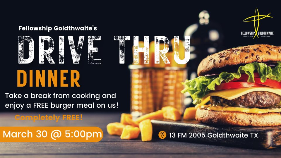 Join us for a Drive Thru Dinner @ Fellowship Goldthwaite! Free Burger meal for you and your family!