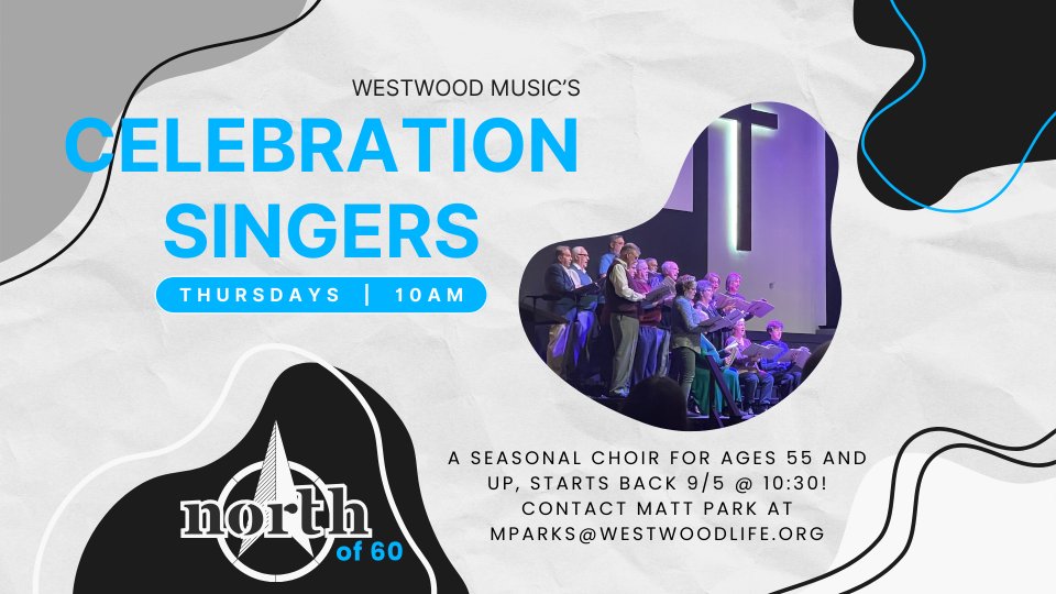 If you are over the age of 55, come join us for our North of 60 ministries choir, called Celebration singers. No need to register, just come hang out with us!