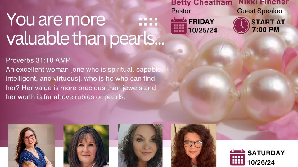 Join us for two days filled with power packed messages to recharge your faith. Friday, Oct. 25th 7:00-9:00 pm & Saturday, Oct. 26th 9:00 am-12:00 pm. Lunch will be provided on Saturday. Ladies, come and invite all your friends. Its going to be an extraordinary weekend.