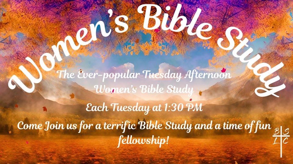 Ladies, Join your friends for the Tuesday afternoon women's Bible Study. This is a very popular Bible study that is loads of fun.
