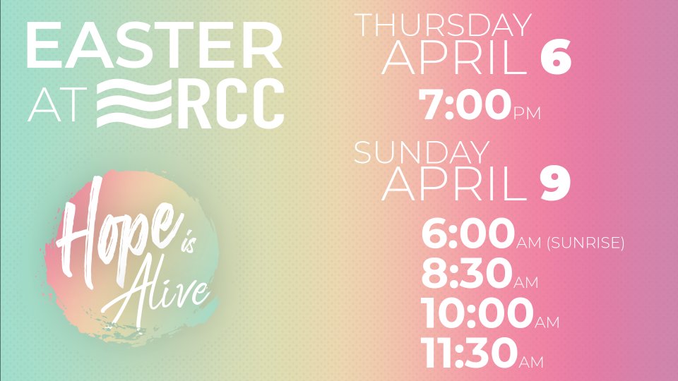 Hope is alive, friends! During the Easter season we celebrate all that Jesus has done for us! He lived a perfect life, then voluntarily died on the cross for our sins, and rose again three days later. It is because of his resurrection on Easter morning that you and I have hope, peace and freedom from sin! We are excited to fellowship with you at our Easter Celebration both in person and online in our virtual community! We encourage you to reach out to your friends and family that you might not be seeing right now, and invite them to celebrate Easter with you at either our Thursday night service (7:00 PM), our sunrise service (6:00 AM) or our Sunday morning services (8:30 AM, 10:00 AM or 11:30 AM). We will stream at https://riverchristian.online.church. We are grateful for this opportunity to spread the hope we have in Jesus Christ!