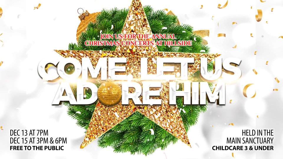 Join us for a heartwarming celebration of the season at Hillside’s beloved Come, Let Us Adore Him Christmas Concerts. This year, we are offering three performances: Friday, December 13 at 7:00 PM, and Sunday, December 15 at 3:00 PM and 6:00 PM. Due to popular demand, we've added an extra Sunday concert to accommodate our growing audience.