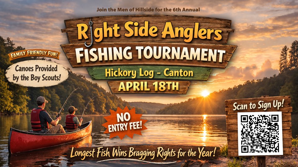 The Men of Hillside invite you to participate in the 6th Annual Right Side Anglers Fishing Tournament! Bring a friend and enjoy God’s creation with a relaxing morning on the water at Hickory Log in Canton. This laid-back, family-friendly tournament has no entry fee, and the angler who catches the longest fish will earn bragging rights for the year. Don’t have access to a boat? No problem. Motors aren’t allowed on the reservoir, so the Boy Scouts of America will have canoes available to borrow at no cost. If you plan to attend, please sign up and let us know you’re coming!