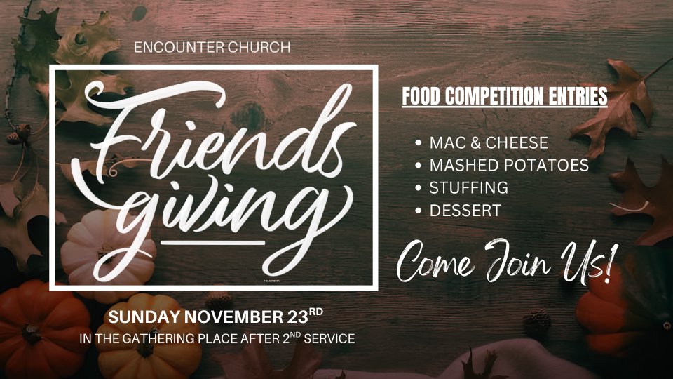 It’s time for our annual Friendsgiving Celebration—and you’re invited! Join us after the 2nd service for an afternoon filled with food, fellowship, and friendly competition.
