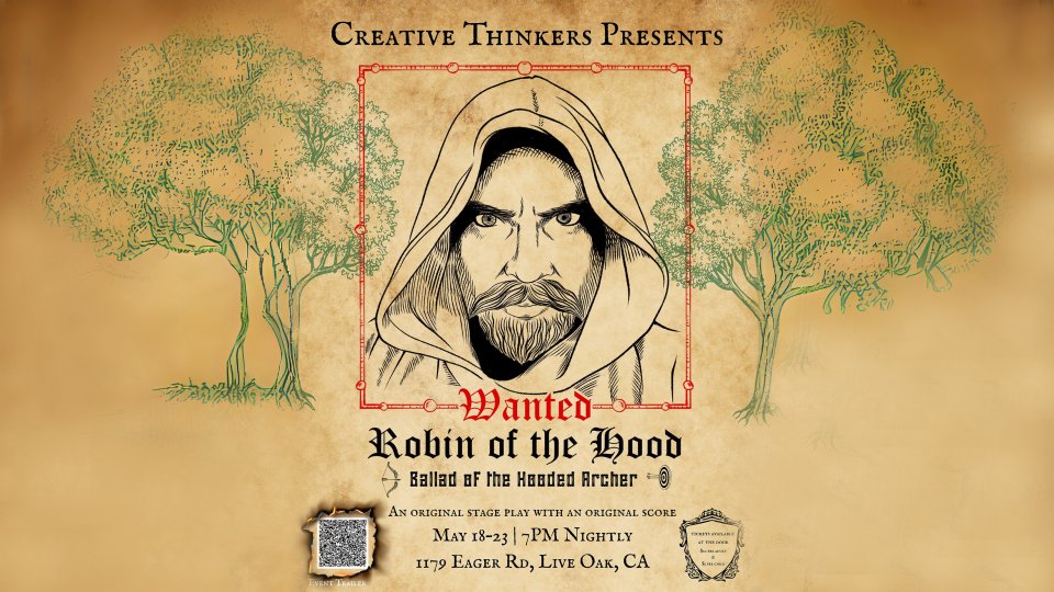 YUBA CITY, CA – Creative Thinkers is thrilled to present Robin Hood: The Ballad of the Hooded Archer, an original stage adaptation, at the Church of Glad Tidings from May 18–23, 2025. This fresh take on the timeless legend of Robin Hood bursts with humor, romance, thrilling swordplay, and a modern twist, making it a perfect adventure for audiences of all ages.