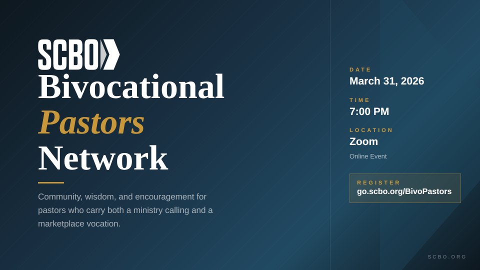 Bivocational ministry is a unique calling — and it deserves a community built around it. This gathering brings together bivocational pastors every other month on Zoom for honest conversation, peer encouragement, and practical wisdom from others who understand the demands of balancing ministry with marketplace work.