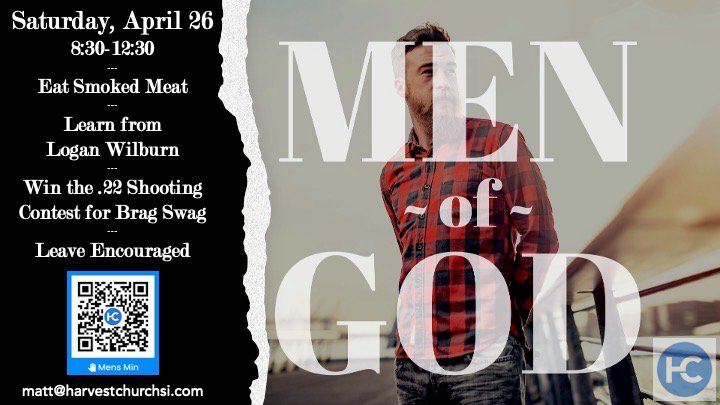 Men join us for a morning of fun and fellowship. Eat smoked meat, learn from Logan Wilburn and win the .22 shooting contest for brag swag! Matt will give the directions on how to get there. Email him at Matt@harvestchurchsi.com and let him know you are coming.
