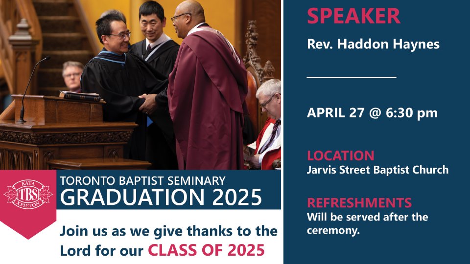 Please join us for TBS Graduation 2025! This is a time to dedicate our graduates to the Lord, pray for them as they enter ministry, and give thanks to God for each of them. Our speaker will be Rev. Haddon Haynes. This is a worship service as well as graduation ceremony. Everyone is welcome!
