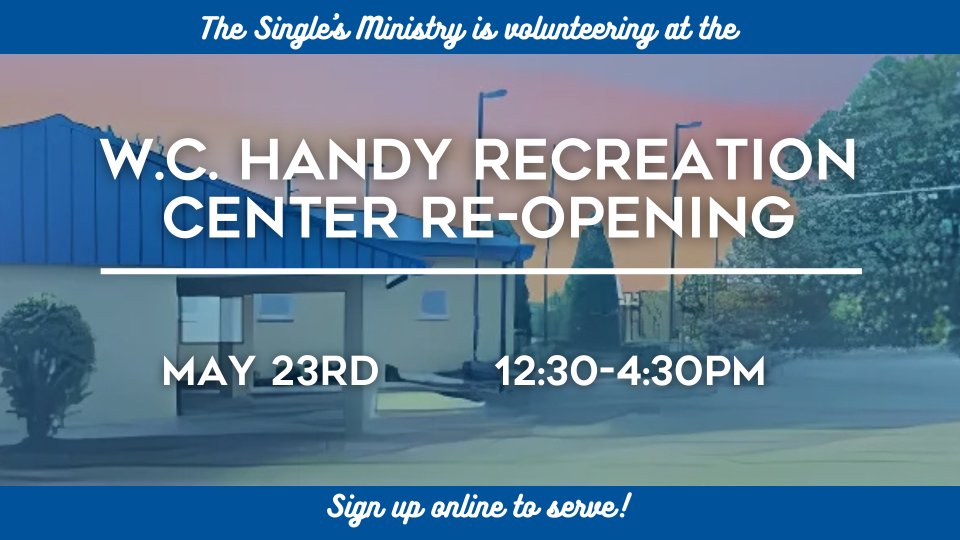 The Singles Ministry is helping with a service project for the Handy Recreation Center Re-opening event on May 23rd, from 12:30-4:30PM. All volunteers are welcome if you would like to serve with this event! .