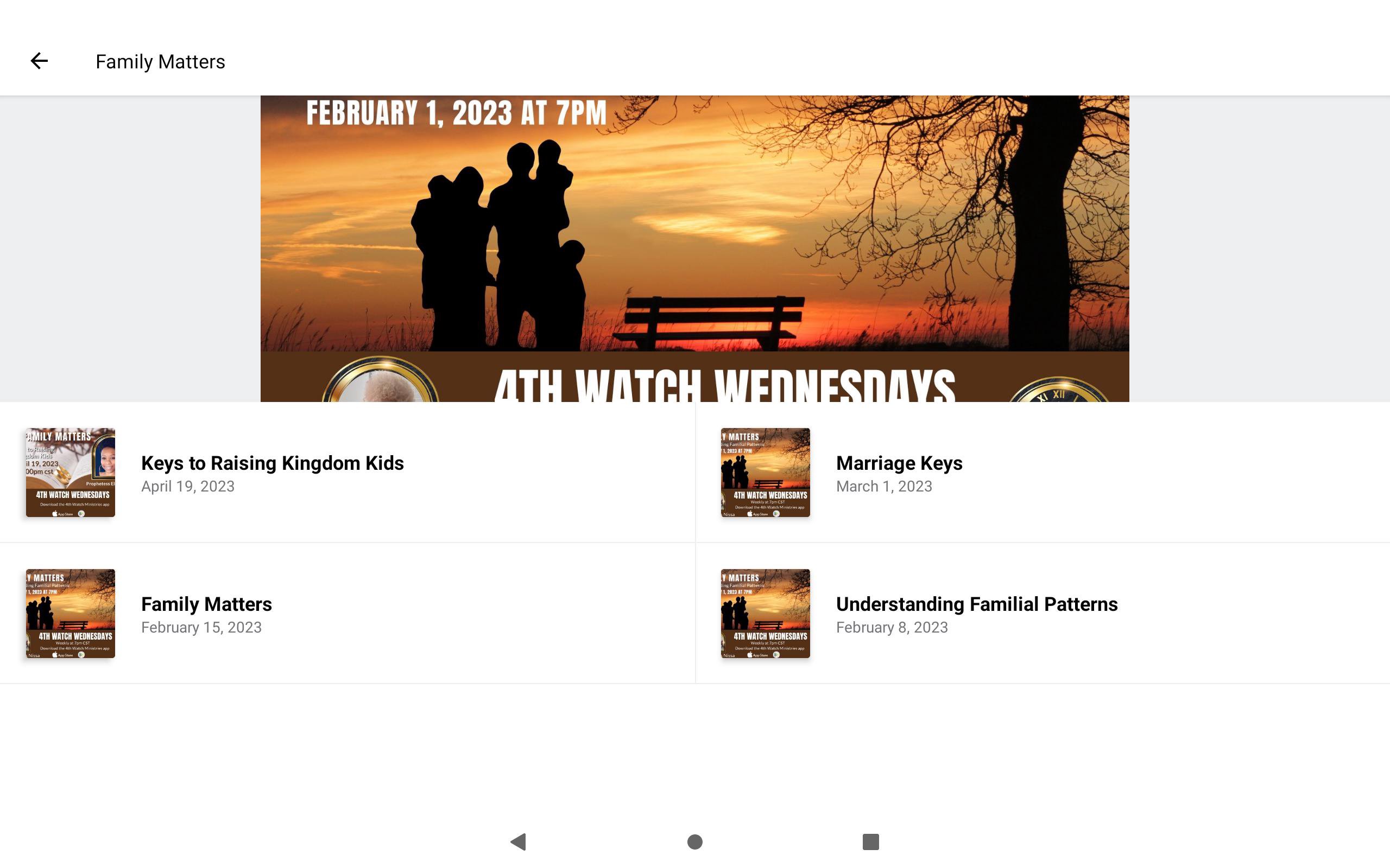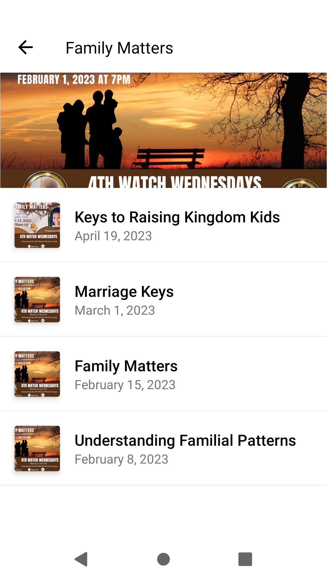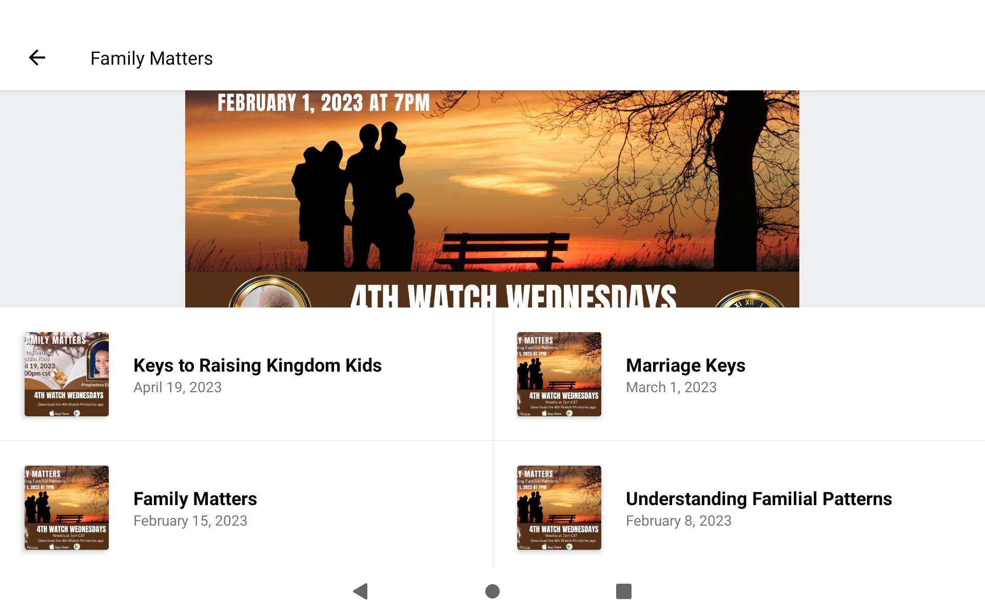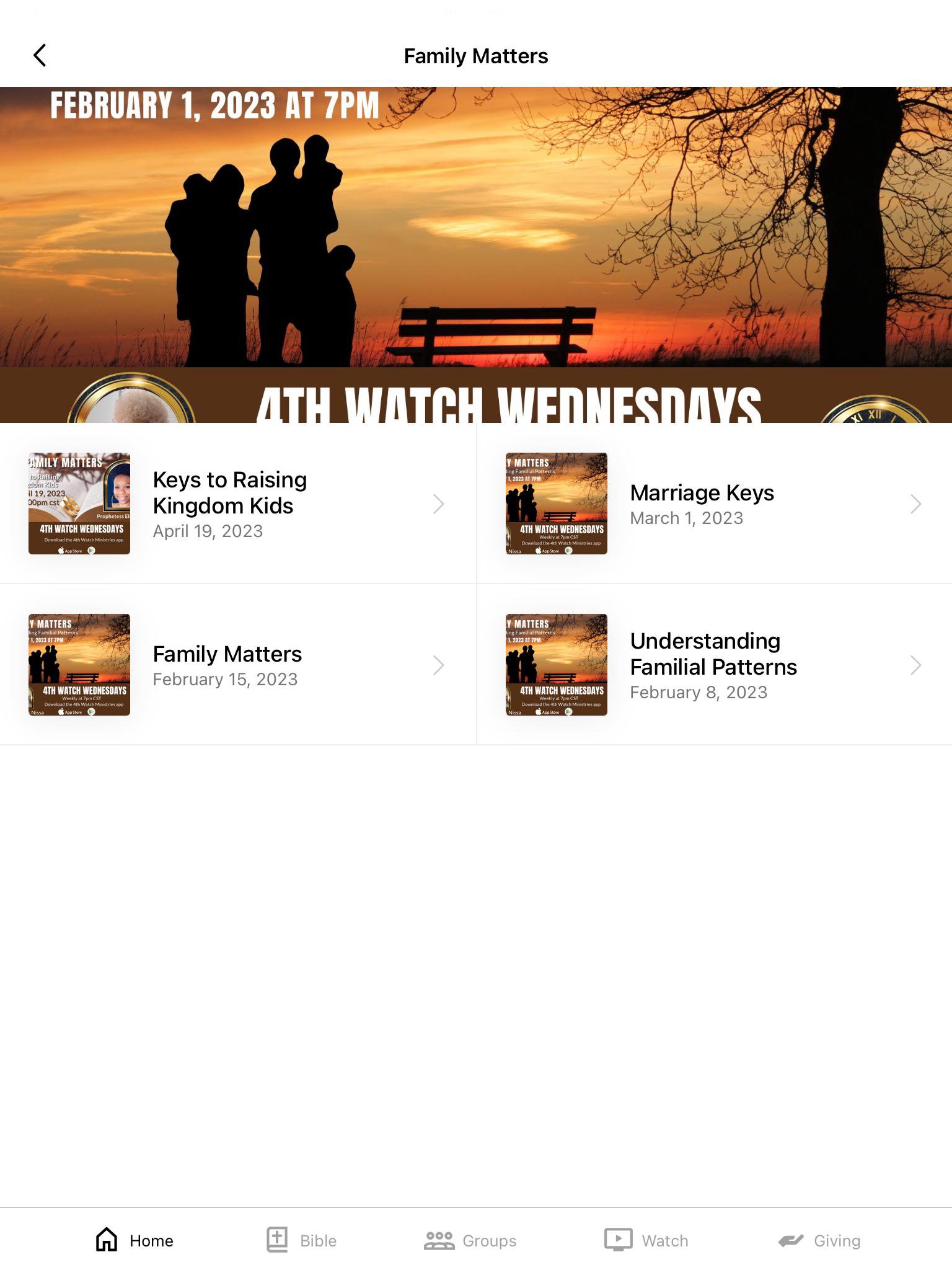 4th Watch Ministries is committed to the focus on discipleship, identity building, intercession, and study of the word of God. The app allows the continued building of the 4th Watch community virtually, providing live teachings, chat, prayer, and devotional opportunities at your fingertips. The 4th Watch app will also provide notifications and the ability to register for 4th Watch events in various locations worldwide.
