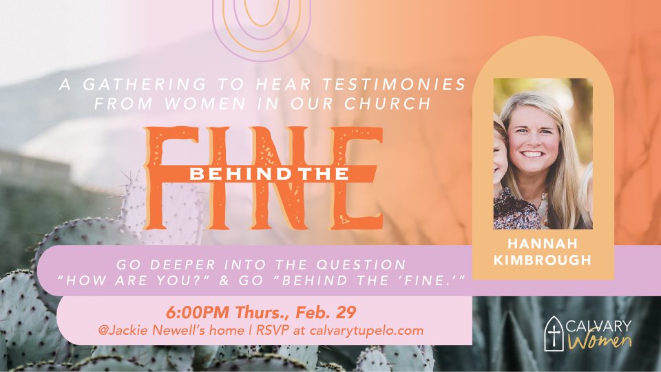 “Because of the Lord’s great love we are not consumed, for his compassions never fail. They are new every morning; great is your faithfulness..” - Lamentations 3:22–23 Come as you are and join us for a night of testimony and fellowship! All ladies are invited to join us for a "Behind the Fine" fellowship as Hannah Kimbrough shares her testimony of God’s faithfulness. RSVP online or contact the church office. Contact the church office for the address. We will be meeting at the home of Jackie Newell. What is Behind the Fine? Behind the Fine meets four times a year. Women fellowship together and hear God-honoring testimonies of other women and their walk through difficult days. It is an encouraging experience to go behind the surface of who we are and to really listen to the heart of women that have proved God to be faithful. It’s a change to go deeper into the question of “How are you?” and to go “Behind the Fine.”